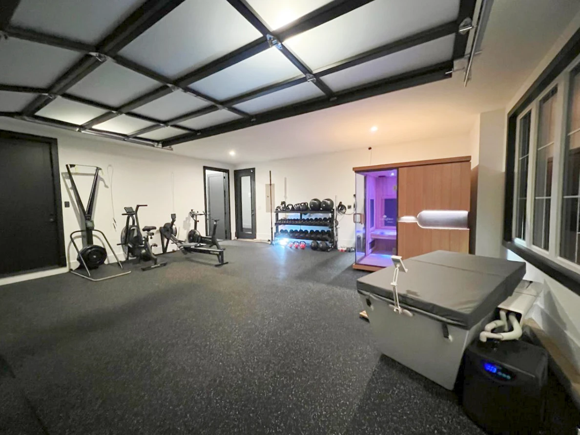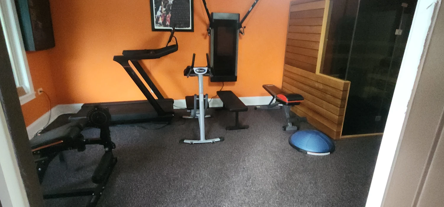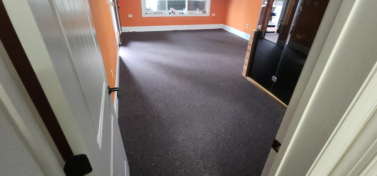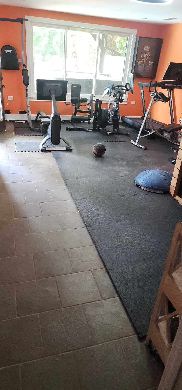 Start your home gym with the best quality flooring you can get! We can remove the carpet or lay over the existing flooring. There are a plethora of color options to choose from. This color is called Tigers, which is a black flooring with orange and grey flecks.